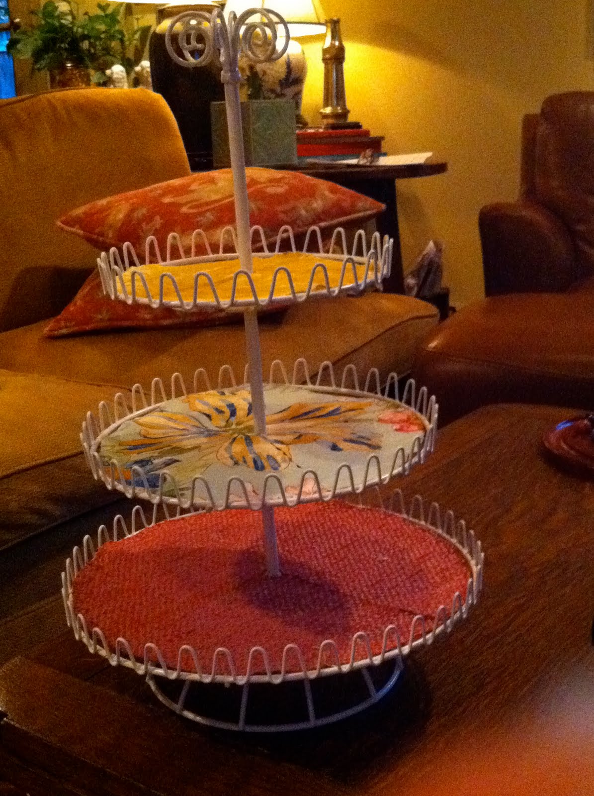 Yesterday, my good friend Keni and I bought these pastry trays at World Market, and today we glued fabric into the bottom of each layer so that the tray can be used as a jewelry holder.